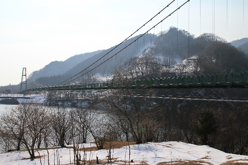 「本州で一番長い無補剛桁歩道吊り橋」です。塩原ダムのダム湖にかかる長ーい吊り橋。 山々と湖の調和がすばらしくきれいです。